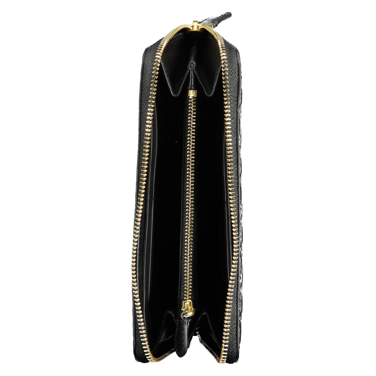 portafoglio 4 scomparti, portamonete, spazi interni formato da card, dettagli a contrasto, chiusura con zip, logo