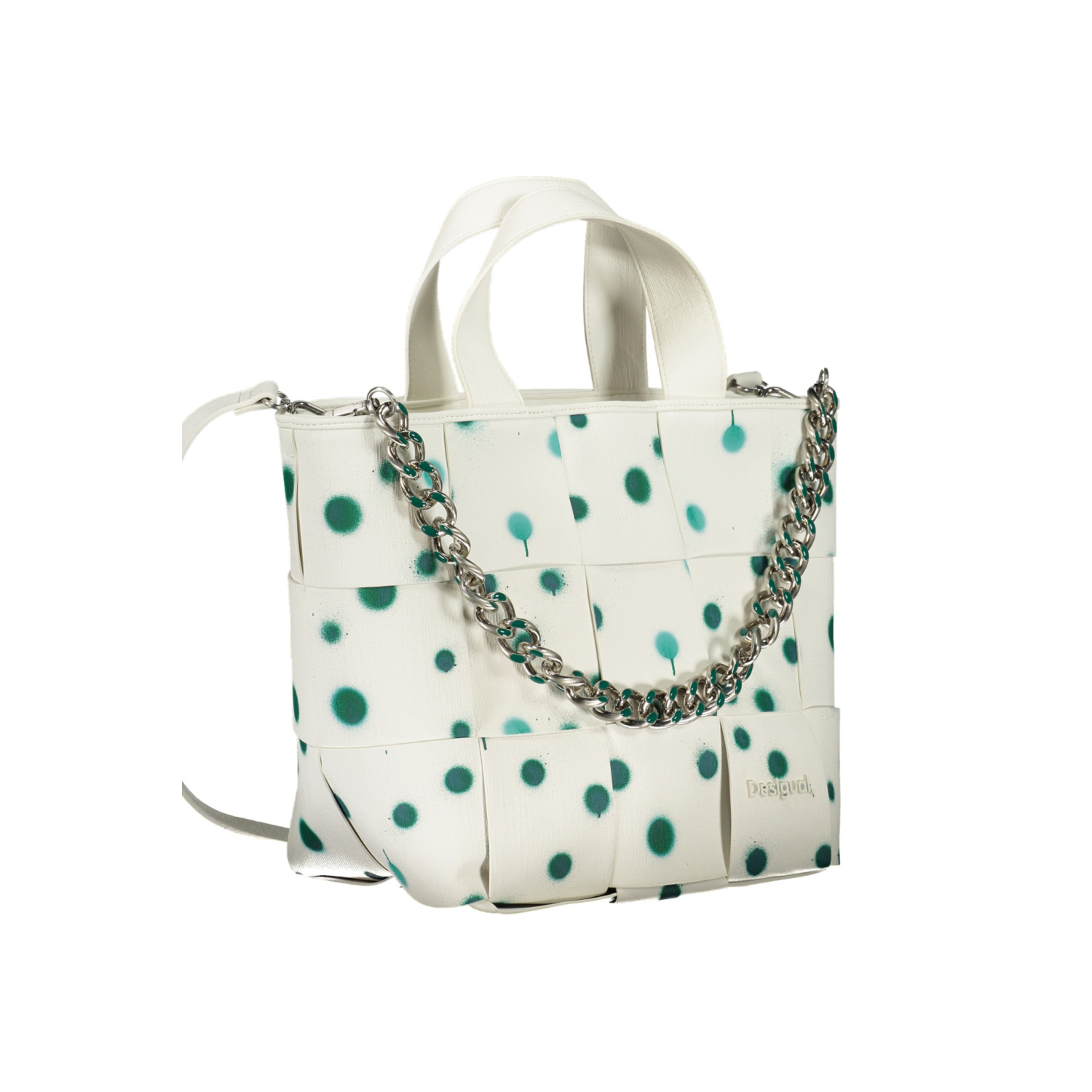 BORSA 2 MANICI, 1 MANICO A SPALLA IN CATENA REMOVIBILE, TRACOLLA REGOLABILE E REMOVIBILE, 1 TASCA INTERNA, DETTAGLI A CONTRASTO, CHIUSURA CON ZIP, LOGO