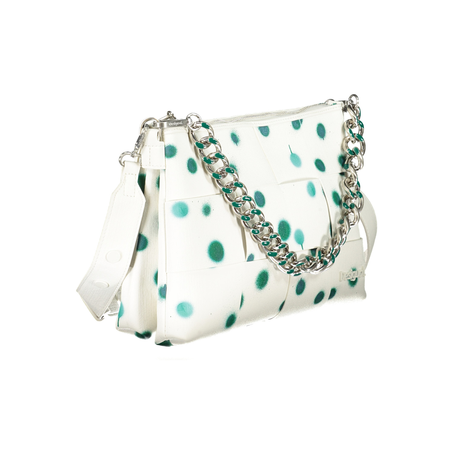 BORSA A POIS, 1 MANICO A MANO, 1 MANICO A SPALLA IN CATENA REMOVIBILE, TRACOLLA REGOLABILE E REMOVIBILE, 2 SCOMPARTI, 1 TASCA CENTRALE, 1 TASCA INTERNA, DETTAGLI A CONTRASTO, LOGO