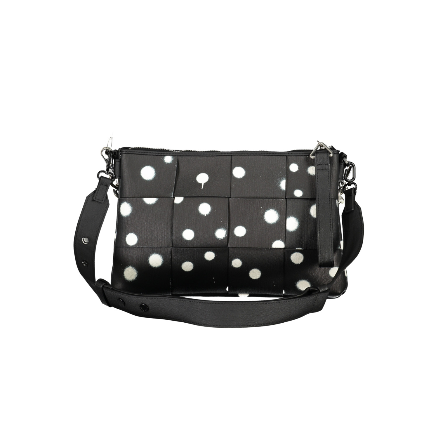BORSA A POIS, 1 MANICO A MANO, 1 MANICO A SPALLA IN CATENA REMOVIBILE, TRACOLLA REGOLABILE E REMOVIBILE, 2 SCOMPARTI, 1 TASCA CENTRALE, 1 TASCA INTERNA, DETTAGLI A CONTRASTO, LOGO