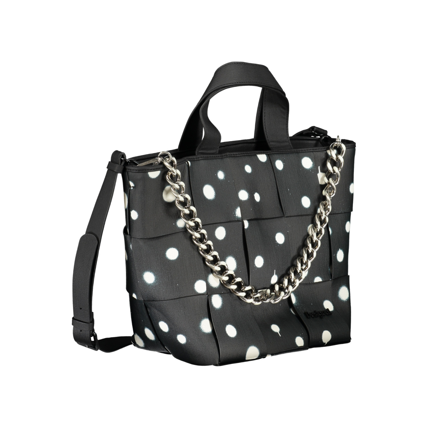BORSA 2 MANICI, 1 MANICO A SPALLA IN CATENA REMOVIBILE, TRACOLLA REGOLABILE E REMOVIBILE, 1 TASCA INTERNA, DETTAGLI A CONTRASTO, CHIUSURA CON ZIP, LOGO