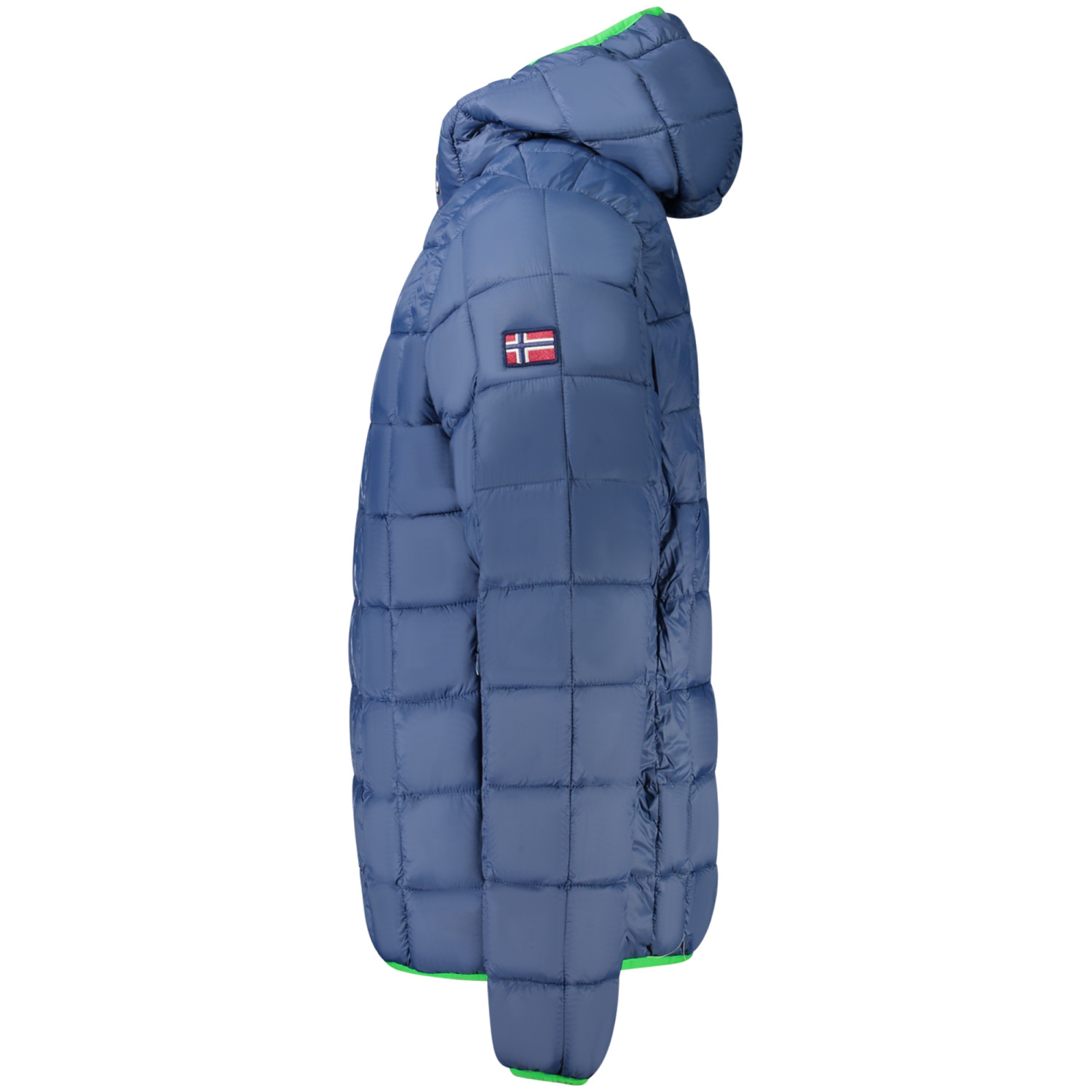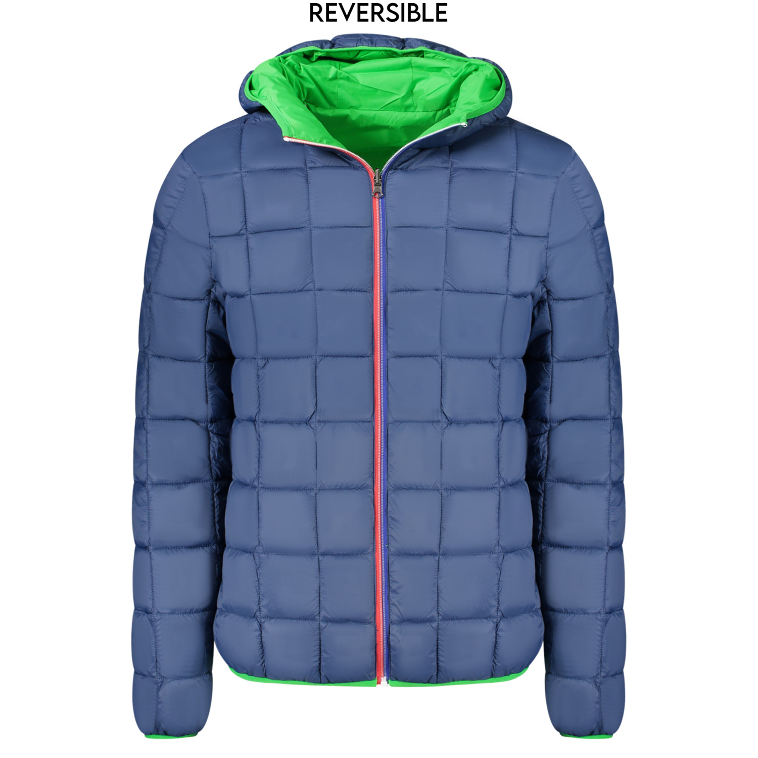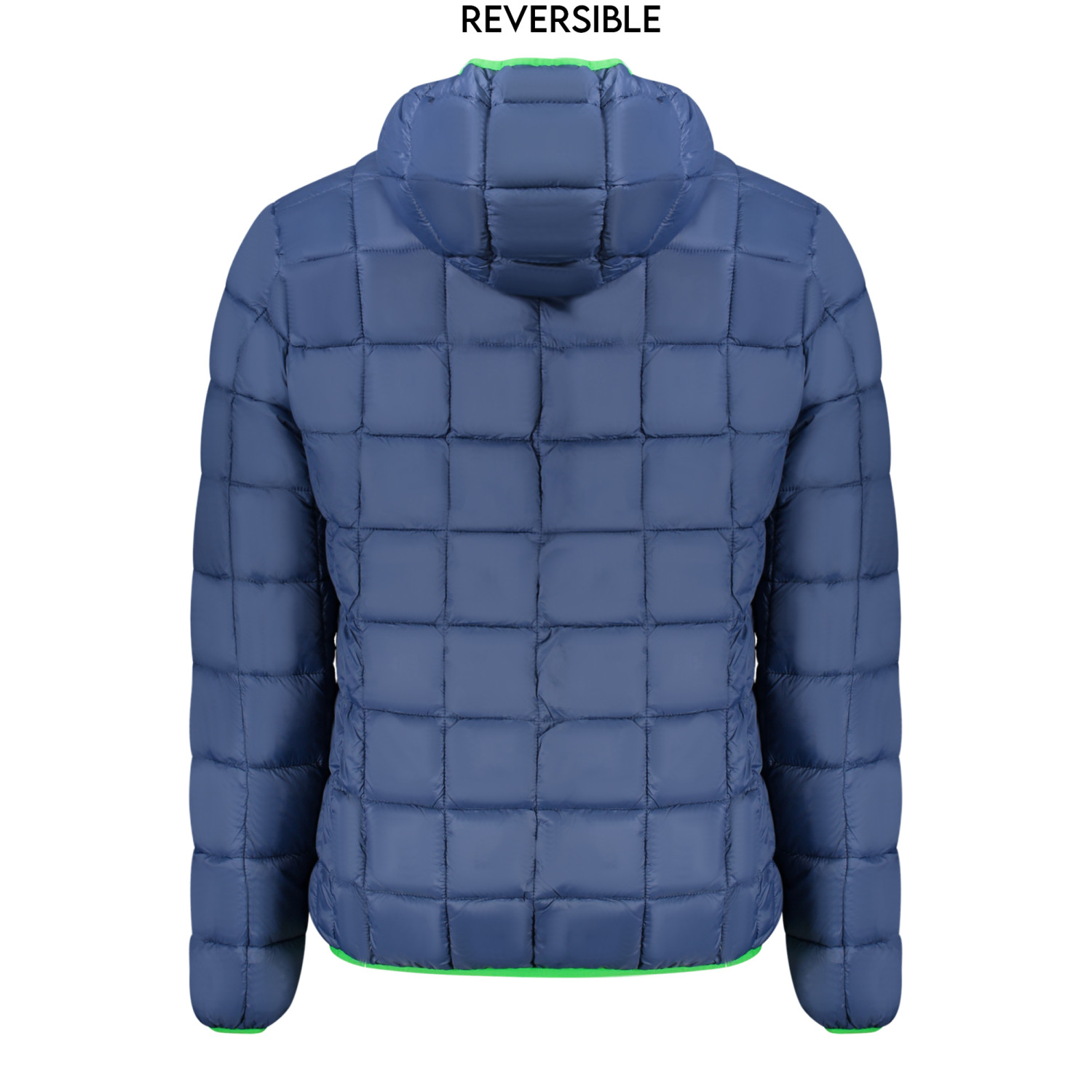 GIUBBOTTO MANICHE LUNGHE CON CAPPUCCIO, REVERSIBILE VERDE/BLU, 2 TASCHE ESTERNE, 2 TASCHE INTERNE, ZIP, APPLICAZIONE, LOGO