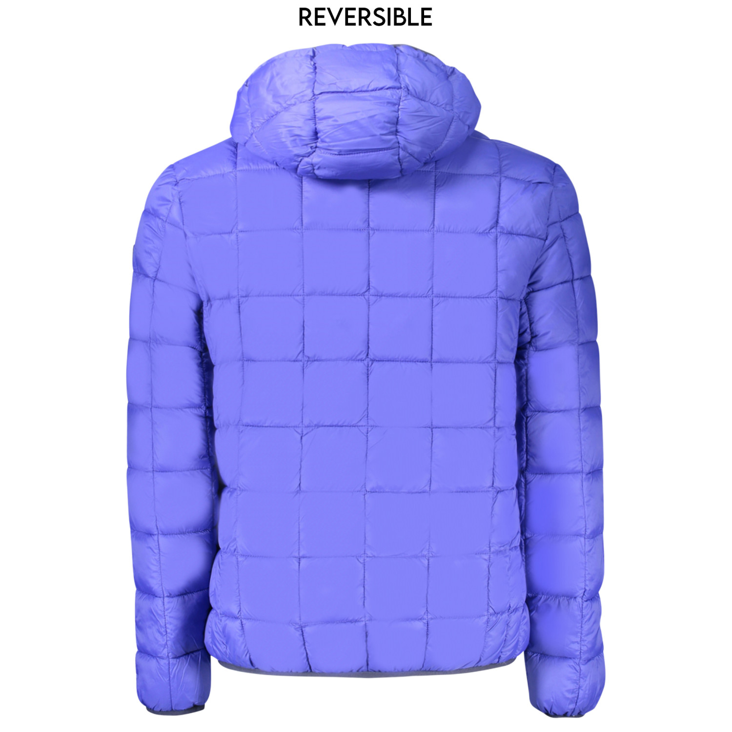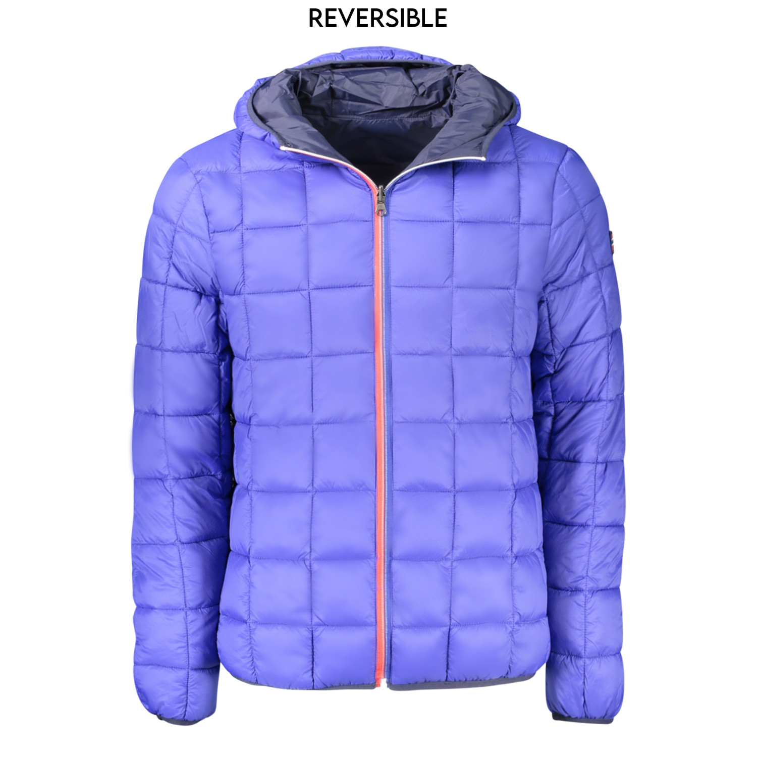 GIUBBOTTO MANICHE LUNGHE CON CAPPUCCIO, REVERSIBILE BLU/BLU ROYALE, 2 TASCHE ESTERNE, 2 TASCHE INTERNE, ZIP, APPLICAZIONE, LOGO